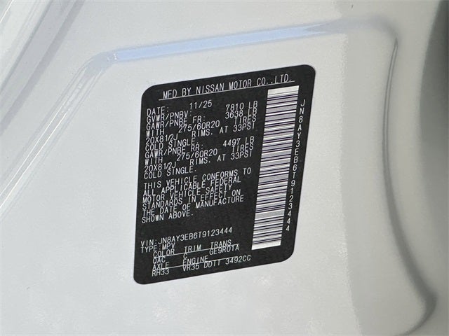 4WD, 12 Speakers, 3rd row seats: split-bench, 4-Wheel Disc Brakes, ABS brakes, Air Conditioning, Alloy wheels, AM/FM radio: SiriusXM w/360L, Anti-whiplash front head restraints, Apple CarPlay/Android Auto, Auto High-beam Headlights, Auto tilt-away steering wheel, Auto-dimming door mirrors, Auto-dimming Rear-View mirror, Auto-leveling suspension, Automatic temperature control, Brake assist, Bumpers: body-color, Climate Controlled Heated and Ventilated Front Seats, Compass, Delay-off headlights, Driver door bin, Driver vanity mirror, Dual front impact airbags, Dual front side impact airbags, Electronic Stability Control, Emergency communication system: NissanConnect Services, Four wheel independent suspension, Front anti-roll bar, Front Bucket Seats, Front Center Armrest, Front dual zone A/C, Front fog lights, Front reading lights, Fully automatic headlights, Garage door transmitter: HomeLink, Genuine wood dashboard insert, Heated door mirrors, Heated front seats, Heated rear seats, Heated steering wheel, HVAC memory, Illuminated entry, Knee airbag, Leather steering wheel, Low tire pressure warning, Memory seat, Navigation system: Google Maps, Occupant sensing airbag, Outside temperature display, Overhead airbag, Overhead console, Panic alarm, Passenger door bin, Passenger vanity mirror, Power door mirrors, Power driver seat, Power Liftgate, Power moonroof, Power passenger seat, Power steering, Power windows, Quilted Leather Seat Trim, Radio: NissanConnect with SiriusXM 360L, Rain sensing wipers, Rear air conditioning, Rear anti-roll bar, Rear reading lights, Rear window defroster, Rear window wiper, Reclining 3rd row seat, Remote keyless entry, Security system, Speed control, Speed-sensing steering, Speed-Sensitive Wipers, Split folding rear seat, Spoiler, Steering wheel memory, Steering wheel mounted audio controls, Tachometer, Telescoping steering wheel, Tilt steering wheel, Traction control, Trip computer, Turn signal indicator mirrors, Variably intermittent wipers, Ventilated front seats, Voltmeter, Wheels: 20 x 8.5J Machined and Painted Alloy, 4WD. 4WD, 12 Speakers, 3rd row seats: split-bench, 4-Wheel Disc Brakes, ABS brakes, Air Conditioning, Alloy wheels, AM/FM radio: SiriusXM w/360L, Anti-whiplash front head restraints, Apple CarPlay/Android Auto, Auto High-beam Headlights, Auto tilt-away steering wheel, Auto-dimming door mirrors, Auto-dimming Rear-View mirror, Auto-leveling suspension, Automatic temperature control, Brake assist, Bumpers: body-color, Climate Controlled Heated and Ventilated Front Seats, Compass, Delay-off headlights, Driver door bin, Driver vanity mirror, Dual front impact airbags, Dual front side impact airbags, Electronic Stability Control, Emergency communication system: NissanConnect Services, Four wheel independent suspension, Front anti-roll bar, Front Bucket Seats, Front Center Armrest, Front dual zone A/C, Front fog lights, Front reading lights, Fully automatic headlights, Garage door transmitter: HomeLink, Genuine wood dashboard insert, Heated door mirrors, Heated front seats, Heated rear seats, Heated steering wheel, HVAC memory, Illuminated entry, Knee airbag, Leather steering wheel, Low tire pressure warning, Memory seat, Navigation system: Google Maps, Occupant sensing airbag, Outside temperature display, Overhead airbag, Overhead console, Panic alarm, Passenger door bin, Passenger vanity mirror, Power door mirrors, Power driver seat, Power Liftgate, Power moonroof, Power passenger seat, Power steering, Power windows, Quilted Leather Seat Trim, Radio: NissanConnect with SiriusXM 360L, Rain sensing wipers, Rear air conditioning, Rear anti-roll bar, Rear reading lights, Rear window defroster, Rear window wiper, Reclining 3rd row seat, Remote keyless entry, Security system, Speed control, Speed-sensing steering, Speed-Sensitive Wipers, Split folding rear s Price includes: $500 - Nissan Conditional Offer - Military Disco