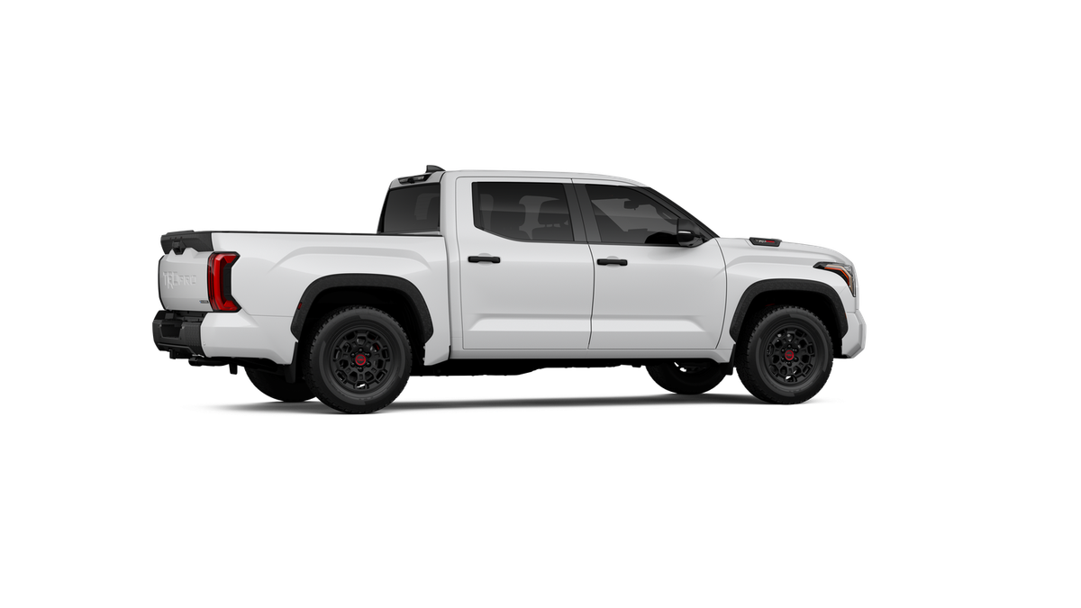 - "TRD PRO" hood badge; black door handles; black window molding and mirror caps; black technical-camo-grained tailgate spoiler and overfenders with marker lights