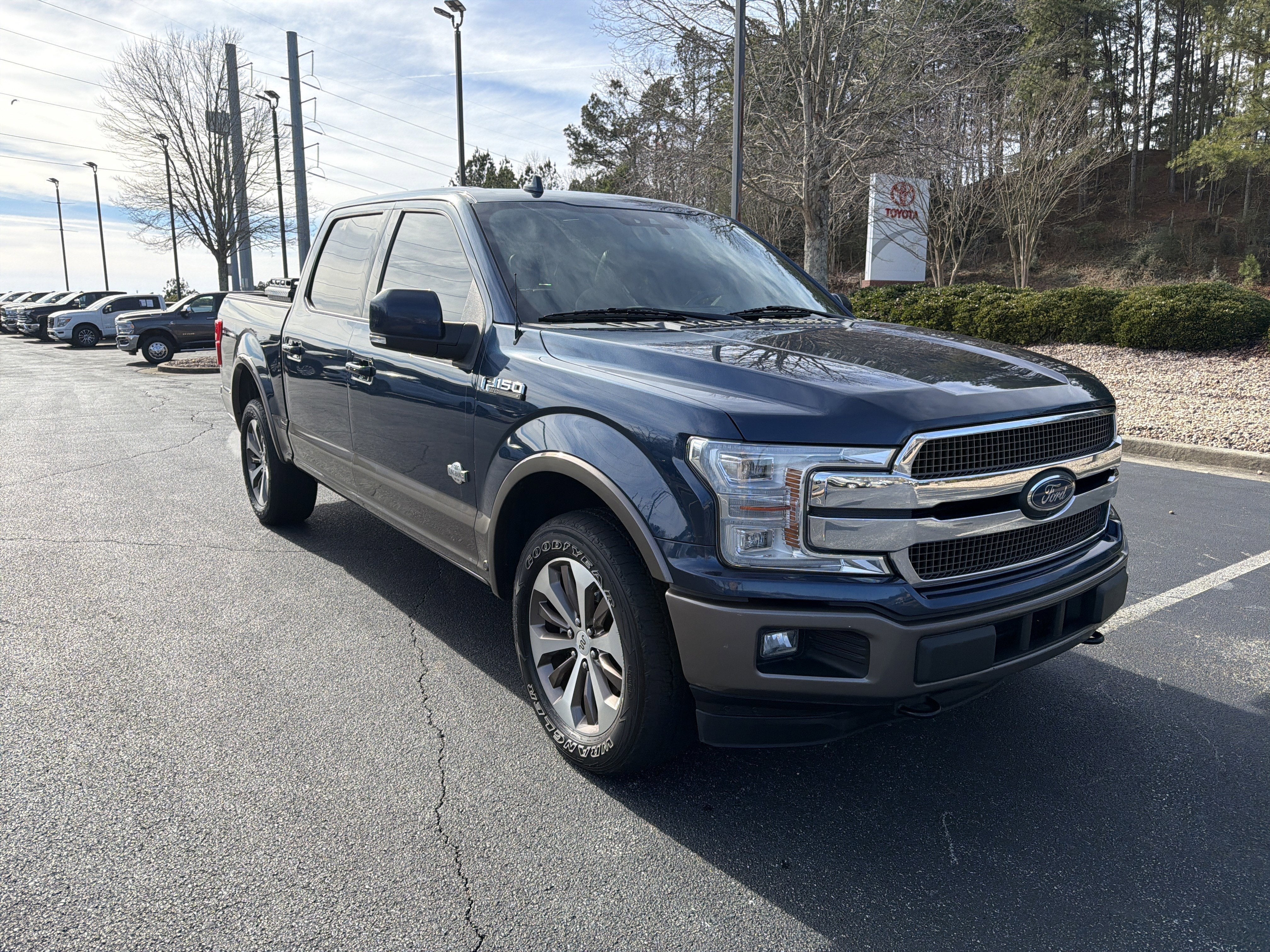 Clean CARFAX. Odometer is 9962 miles below market average!Royal Blue 2019 Ford F-150 King Ranch 4WD 10-Speed Automatic 3.5L V6 EcoBoost F-150 King Ranch, 4D SuperCrew, 3.5L V6 EcoBoost, 10-Speed Automatic, 4WD, Royal Blue, Java Leather, 10 Speakers, 18 Machined-Aluminum Wheels, 20 Machined-Aluminum Wheels, 4-Wheel Disc Brakes, 4x4 FX4 Off-Road Bodyside Decal, ABS brakes, Active Park Assist, Adaptive Cruise Control, Adjustable pedals, Air Conditioning, Alloy wheels, AM/FM radio: SiriusXM, AppLink/Apple CarPlay and Android Auto, Auto High-beam Headlights, Auto tilt-away steering wheel, Auto-dimming door mirrors, Auto-dimming Rear-View mirror, Automatic temperature control, BLIS Blind Spot Information System, Brake assist, Class IV Trailer Hitch Receiver, Compass, Delay-off headlights, Driver door bin, Driver vanity mirror, Dual front impact airbags, Dual front side impact airbags, Electronic Locking w/3.55 Axle Ratio, Electronic Stability Control, Emergency communication system: SYNC 3 911 Assist, Engine Oil Cooler, Equipment Group 601A Luxury, Extended Range 36 Gallon Fuel Tank, Exterior Parking Camera Rear, Front anti-roll bar, Front Bucket Seats, Front Center Armrest, Front dual zone A/C, Front fog lights, Front reading lights, Front wheel independent suspension, Fully automatic headlights, FX4 Off-Road Package, Garage door transmitter, Genuine wood dashboard insert, Genuine wood door panel insert, GVWR: 7,050 lbs Payload Package, Heated door mirrors, Heated front seats, Heated rear seats, Heated steering wheel, Hill Descent Control, Illuminated entry, Inflatable Rear Safety Belts, Integrated Trailer Brake Controller, King Ranch Leather Bucket Seats, Lane-Keeping System, LED Sideview Mirror Spotlights, Low tire pressure warning, Max Trailer Tow Package, Memory seat, Multi-Contour Driver & Passenger Seats, Navigation System, Occupant sensing airbag, Off-Road Tuned Front Shock Absorbers, Outside temperature display, Overhead airbag, Overhead console, Panic alarm, Passenger door bin, Passenger vanity mirror, Pedal memory, Power door mirrors, Power driver seat, Power passenger seat, Power steering, Power windows, Power-Deployable Running Boards, Pro Trailer Backup Assist, Radio data system, Radio: B&O Sound System by Bang & Olufsen, Rain sensing wipers, Rear Parking Sensors, Rear reading lights, Rear seat center armrest, Rear step bumper, Rear window defroster, Remote keyless entry, Security system, SiriusXM Radio, Speed control, Speed-sensing steering, Split folding rear seat, Steering wheel memory, Steering wheel mounted audio controls, SYNC 3, Tachometer, Tailgate Step w/Tailgate Lift Assist, Technology Package, Telescoping steering wheel, Tilt steering wheel, Traction control, Tray Style Floor Liner, Trip computer, Turn signal indicator mirrors, Twin Panel Moonroof, Upgraded Front Stabilizer Bar, Variably intermittent wipers, Ventilated front seats, Voice-Activated Touchscreen Navigation, Voltmeter.Chevrolet of Canton 250 Liberty Blvd Canton, Georgia 30114 678.212.1093.
